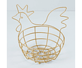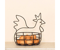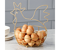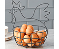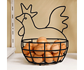 El organizador de huevos en forma de gallina es un práctico accesorio de cocina fabricado con acero plastificado y cromado. Con dimensiones de 26.8 cm de frente, 22.8 cm de profundidad y 28.8 cm de altura, tiene una capacidad para almacenar hasta 30 huevos.