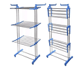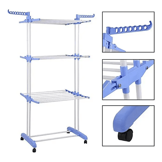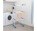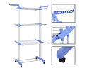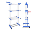 Tendedero vertical tipo torre con ruedas y 3 niveles. Ideal para secar y colgar ropa en espacios reducidos. Compacto, resistente y plegable, soporta hasta 25 kg.